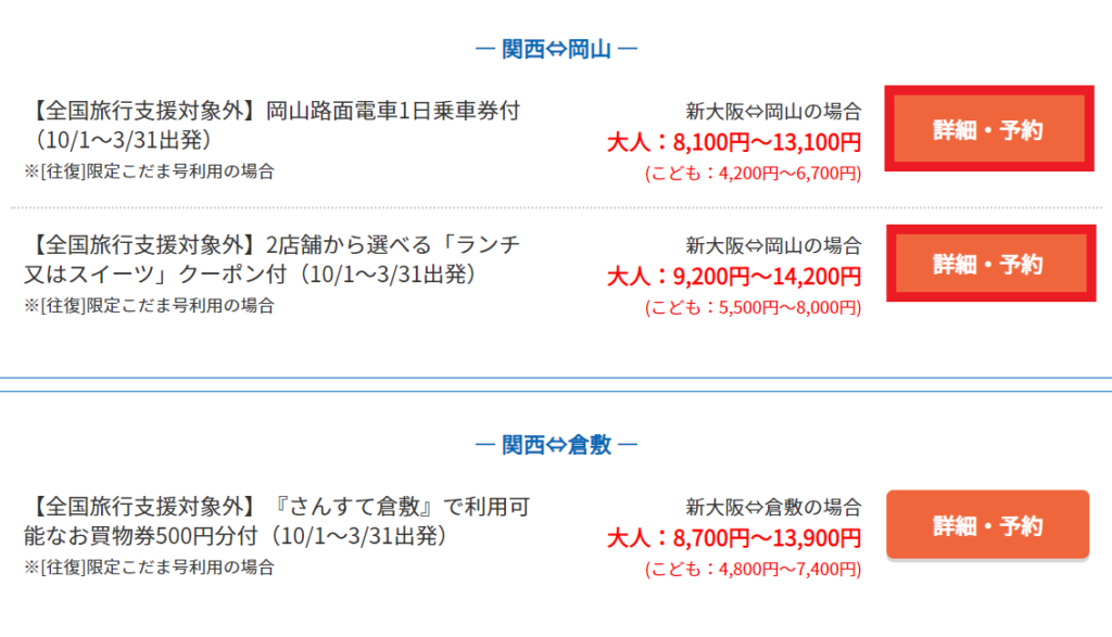 区間(往復) 通常切符(のぞみ号) Web日帰りプラン 新神戸⇔岡山 12,040円 7,300円 新大阪⇔岡山 12,920円 7,900円 『さんすて倉敷』で利用可能なお買物券500円分付